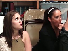 Swallowing a cock during threesome anal sex in the classroom