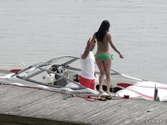 Wild beach. Sexy MILF Platinum naked sunbathing on river bank, random fisherman guy watches. Naked in public. Nude beach