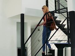 Amazing blonde slut gets her wet pussy fucked in the recording studio